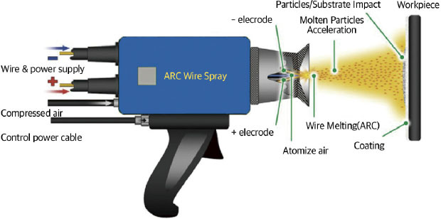 와이어 아크 스프레이 와이어 아크 스프레이 (전기 아크 스프레이라고도 함)는 현장 또는 현장 작업을 위한 간단하고 신속하며 경제적인 열 스프 레이 프로세스입니다. 와이어 아크 스프레이는 코팅 재료의 두 소모 전극 사이에 전기 아크를 놓은 다음 압축된 가스를 사용하여 소재를 분무하 고 기판에 재료를 추진함으로써 작동합니다. 와이어 아크 스프레이는 용사 기술에서 중요한 틈새를 차지하며 고속 증착에 특히 적합합니다.